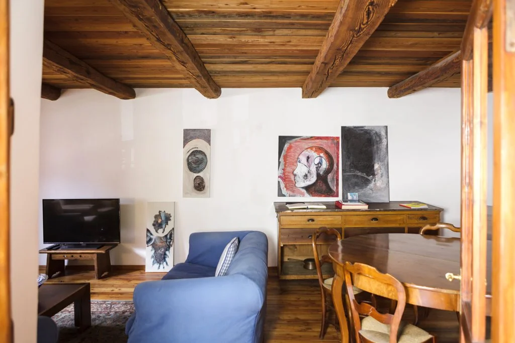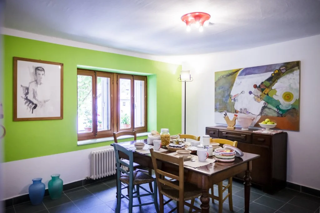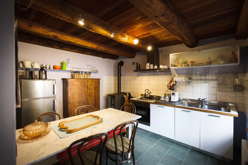Frigo, Forno, 4 piastre ad induzione, bollitore, spremiagrumi, tostapane, stoviglie, pentole, taglieri.